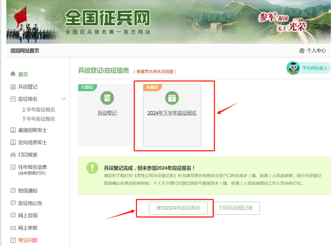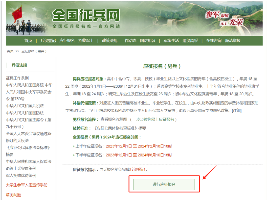 点击“应征报名(男兵)”,跳转到应征报名页面后点击“进行应征报名”。