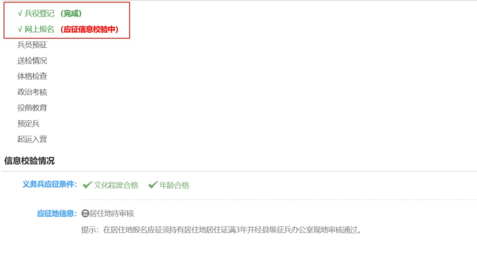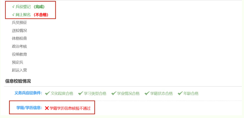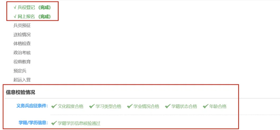 登录全国征兵网,可直接查看报名是否完成。一般可分为:“完成”“不合格”和“应征信息校验中”等情况,如下图所示: