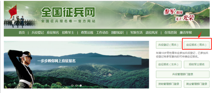 登录全国征兵网,点击“应征报名(男兵)”进入页面;男兵在应征报名之前,要先完成兵役登记。