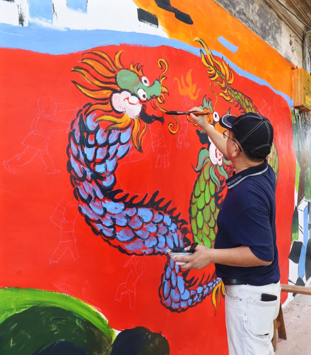 继续往前方看,花鸟、舞龙、白墙灰瓦等充满岭南文化特色的元素映入眼帘,展现出新时代和美水口乡村画卷,传递着村民对美好生活的向往和追求。
